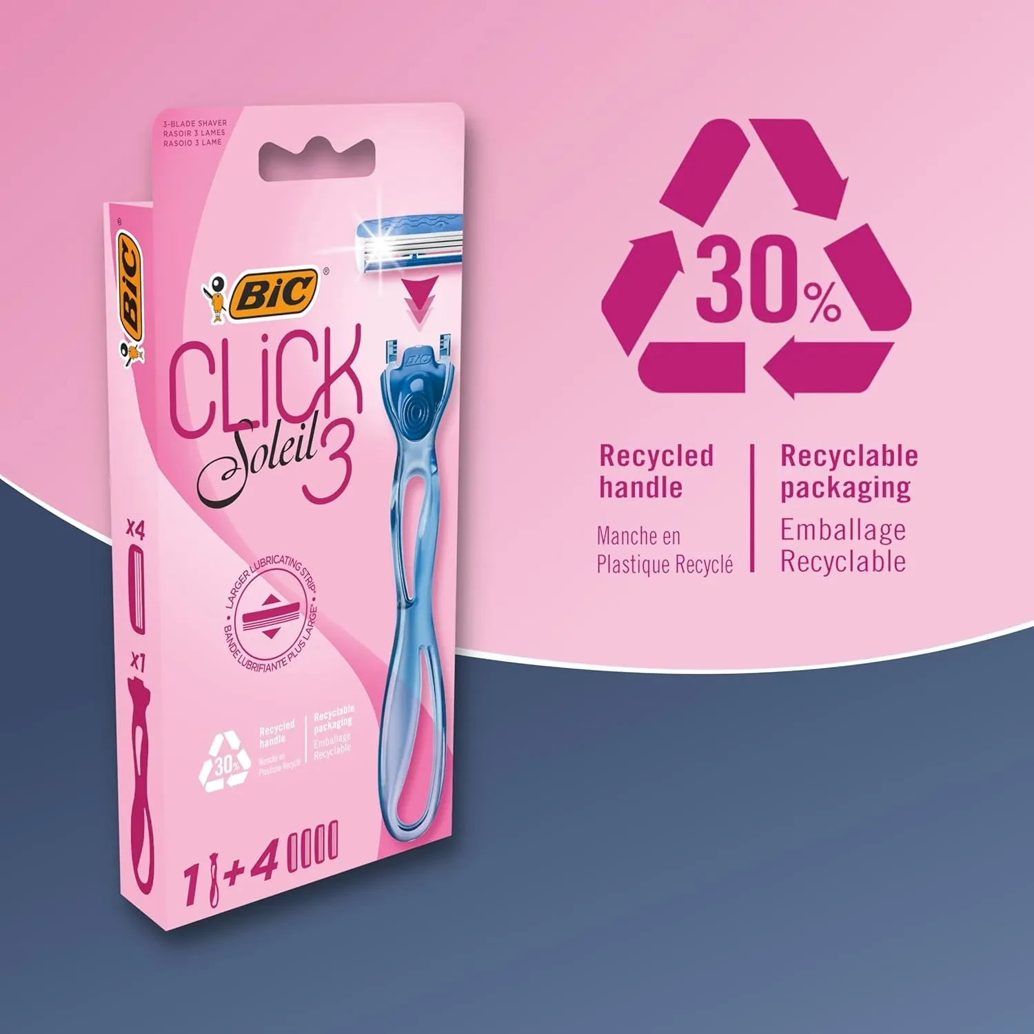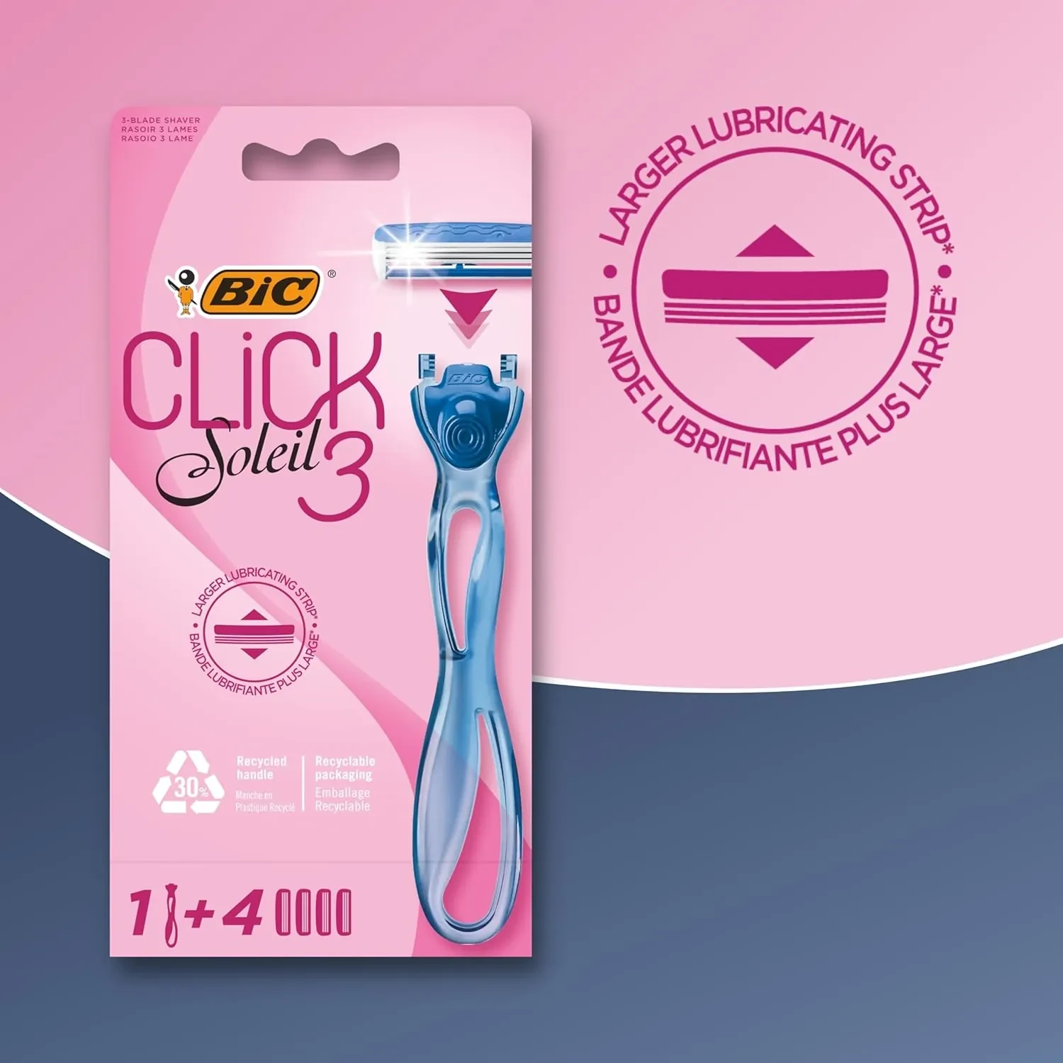 Bic Click Soleil 3 Pink Colored Razor, ergonomic, smooth glide, 4PCS