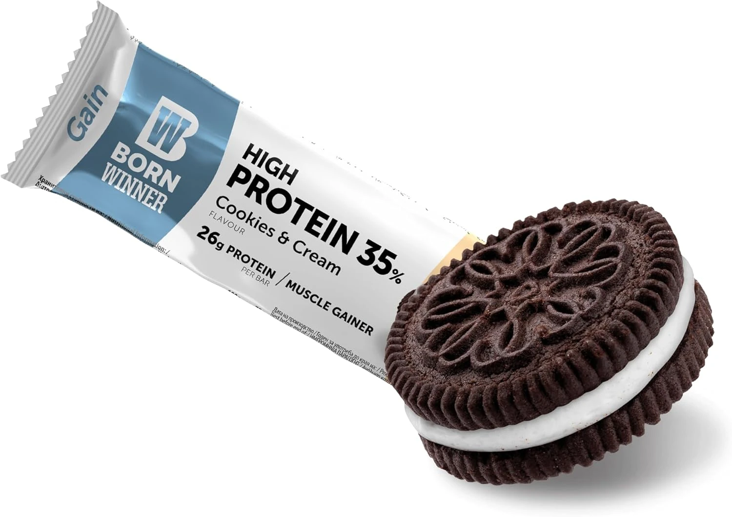 Born Winner Gain Protein Bar, Cookies And Cream, sweet cookie taste, soft texture, convenient snack, 75g