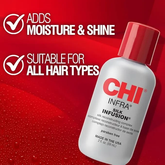 If you desire silky hair, CHI Silk Infusion Silk Reconstructing Complex boosts shine while smoothing frizz and enhancing hair manageability.
