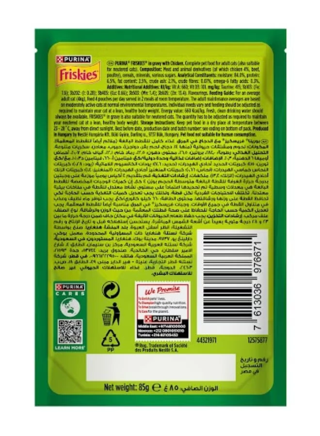 A balanced wet food made with real chicken pieces in rich gravy, providing complete nutrition with protein, vitamins, and minerals for adult cats.