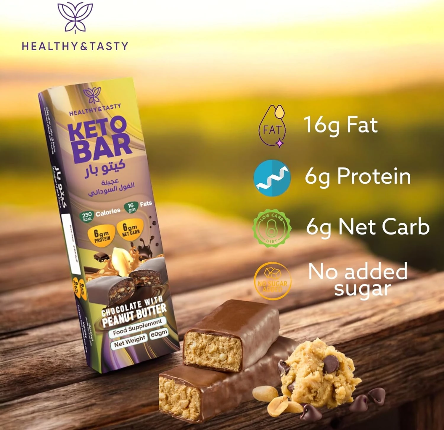 Healthy & Tasty Keto Bar, Chocolate With Peanut Butter, low carb, creamy bite, snack ready, 60g