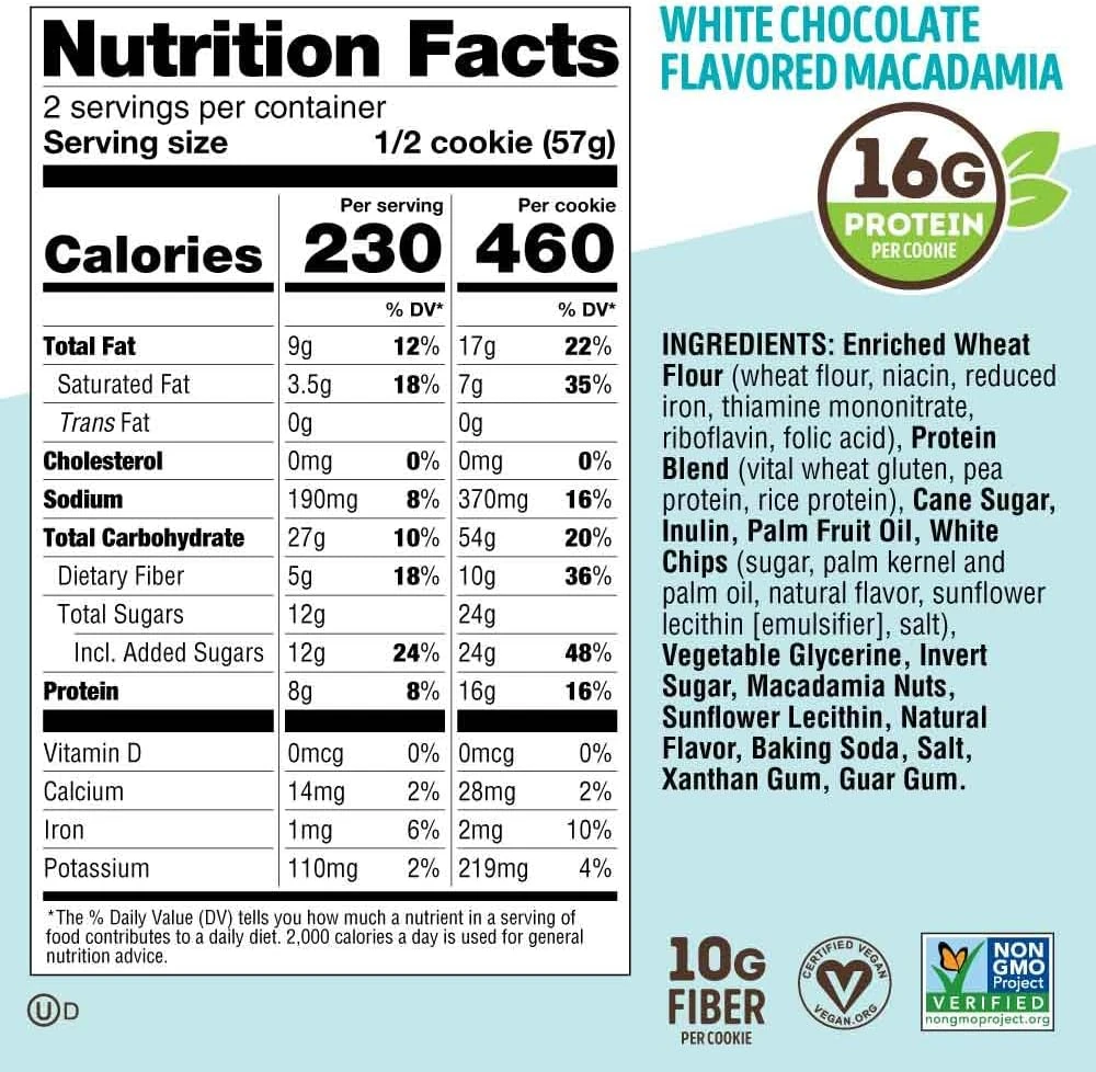 Indulge in the delightful combination of white chocolate and macadamia nuts with Lenny & Larry’s The Complete Cookie! Each cookie is filled with rich white chocolate and macadamia nuts, along with complete plant-based protein and essential nutrients. Perfect for vegans, athletes, or anyone looking for a tasty, energizing snack, these cookies are dairy-free, egg-free, and made with 100% natural ingredients.