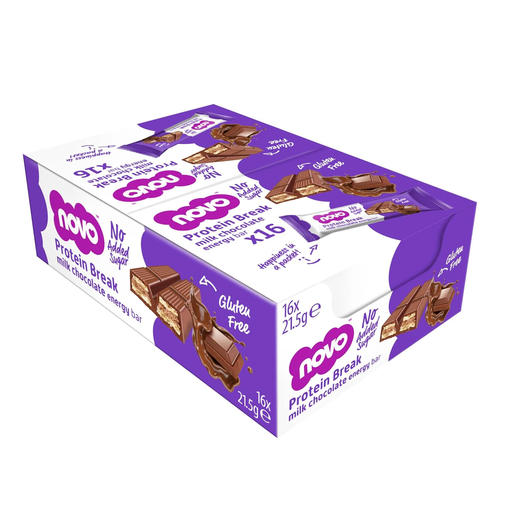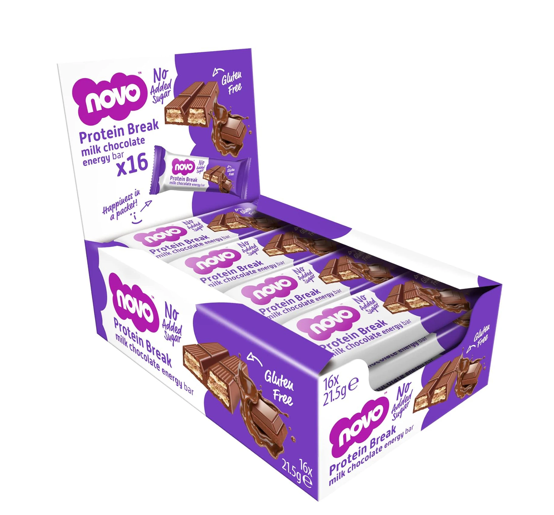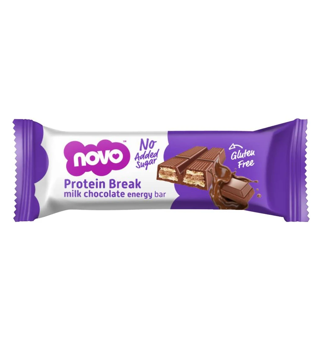 Novo Protein Break is a perfect snack, with an added protein boost, to enjoy anytime and anywhere – not to mention it”s gluten free! delicious low sugar, two finger bar, filled with a chocolate cream and crispy wafer, all enrobed in real milk chocolate.