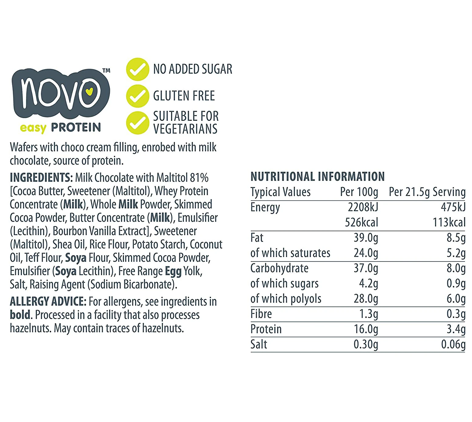 Novo Protein bar is a delicious low sugar, filled with a chocolate cream and crispy wafer, all enrobed in real milk chocolate.