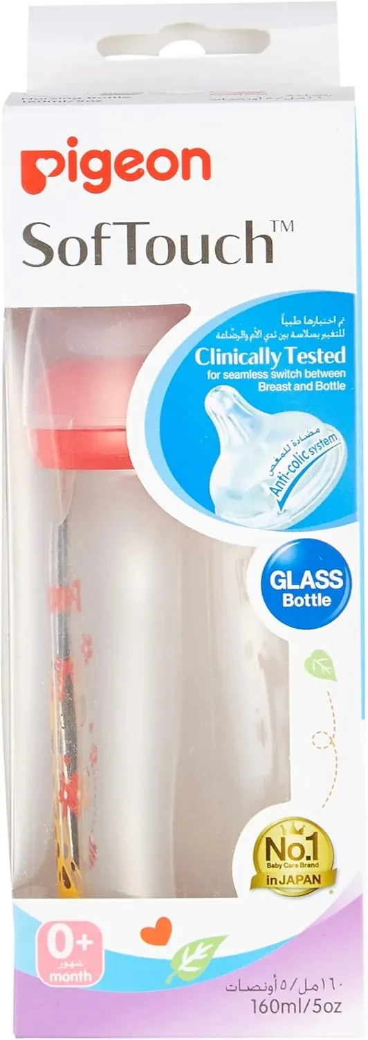 Pigeon Softouch Glass Feeding Bottle (Wide Neck), sturdy glass, safe feeding, 160ml