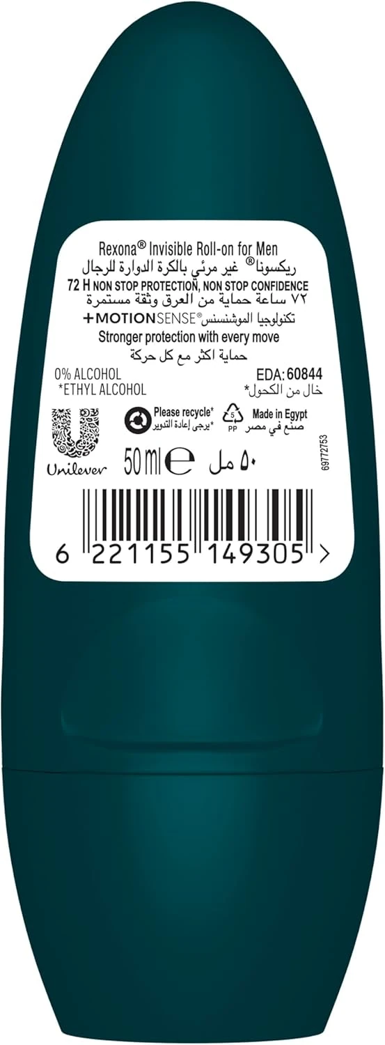 Rexona Antibacterial Invisible Roll-On Deodorant for Men, antibacterial, controls odor, long-lasting, 50ml