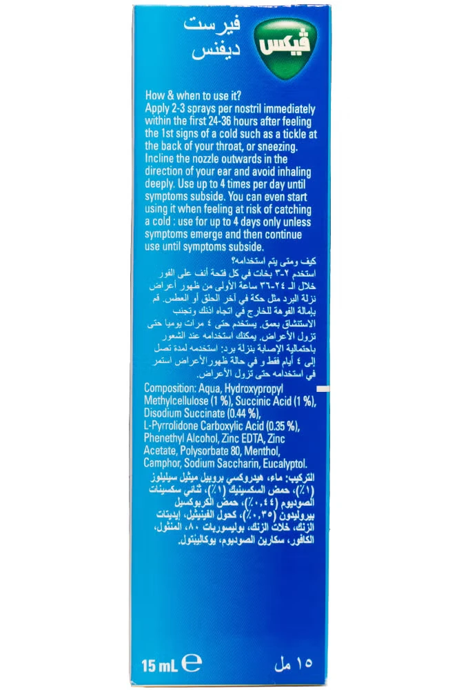 Spray 2-3 times into each nostril at the first sign of cold.