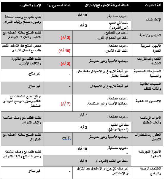 - أنظر للبند رقم 1.1 و البند 2.1 للحالات المؤهلة للاسترجاع والاستبدال.